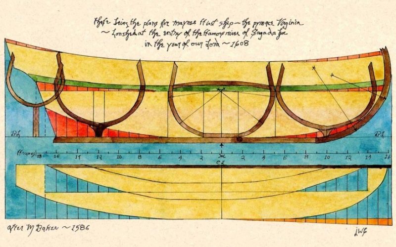 This single sheet line drawing in the style of 16th century shipwright Matthew Baker shows the shape and proportions of Virginia from multiple angles.