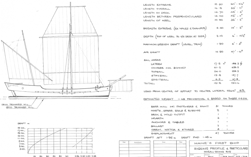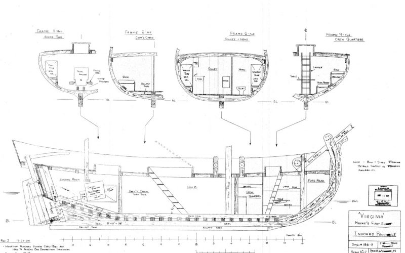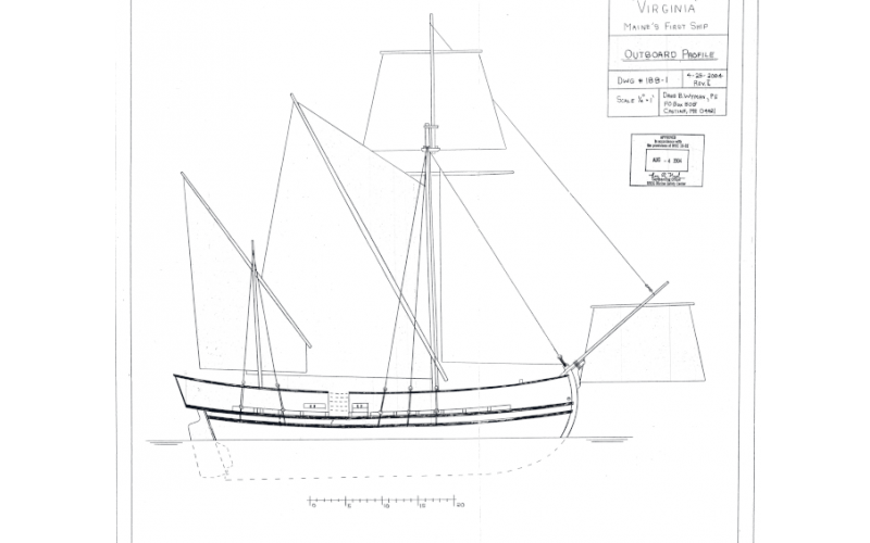 Historical design for Virginia with ocean rigging giving particulars for size and weight.