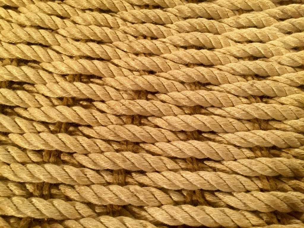 A sword mat is a woven mat that uses thin rope for the warp and twine, or “marlin” for the weft. A flat stick called a “sword” is used in the weaving process, hence the name sword mat. Sword mats are used as cushions wherever two heavy wooden spars come in contact with one another.